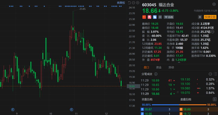 福达合金(603045.SH)再度下跌近4%,报18.66元创近3个月新低,自11月以来累计跌幅近20%,总市值25.27亿元。