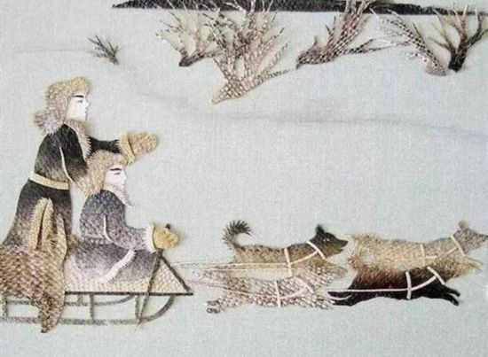 赫哲族鱼皮画中的“鱼皮部落”生活场景。